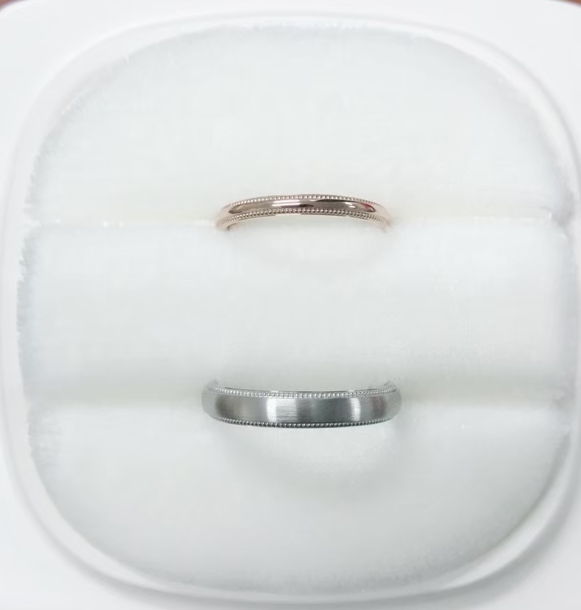 小さなひとつひとつの繊細なミルは、側面から見ても美しく整っており性別問わず着けやすい結婚指輪。
