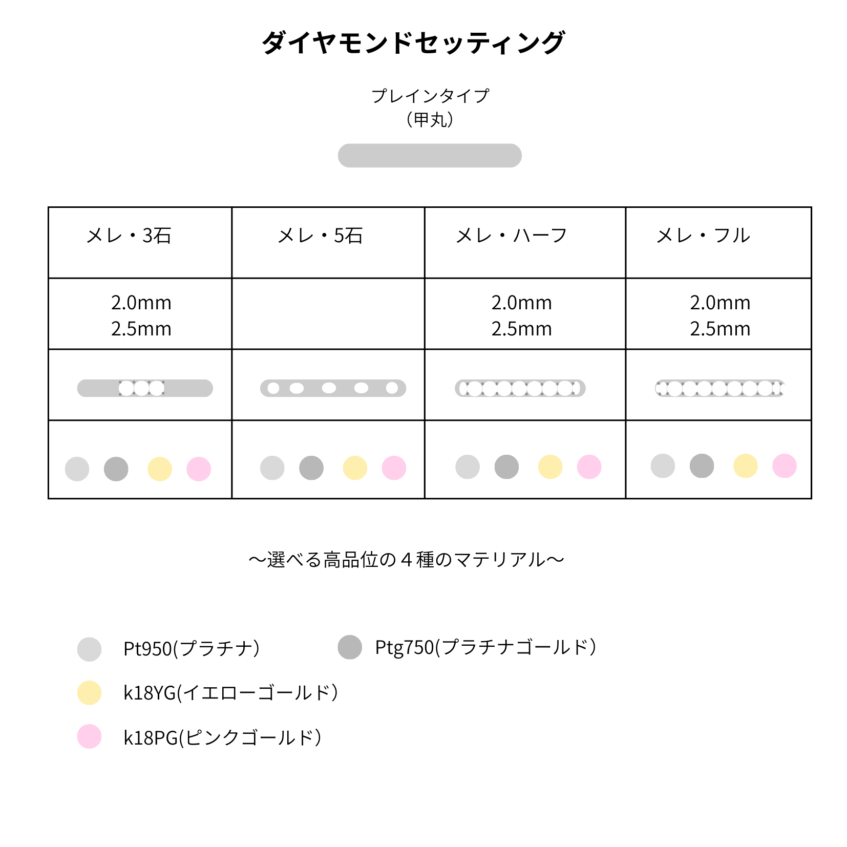 ダイヤモンドの有無やセッティング方法まで様々なご希望に沿ってご用意していただけます。