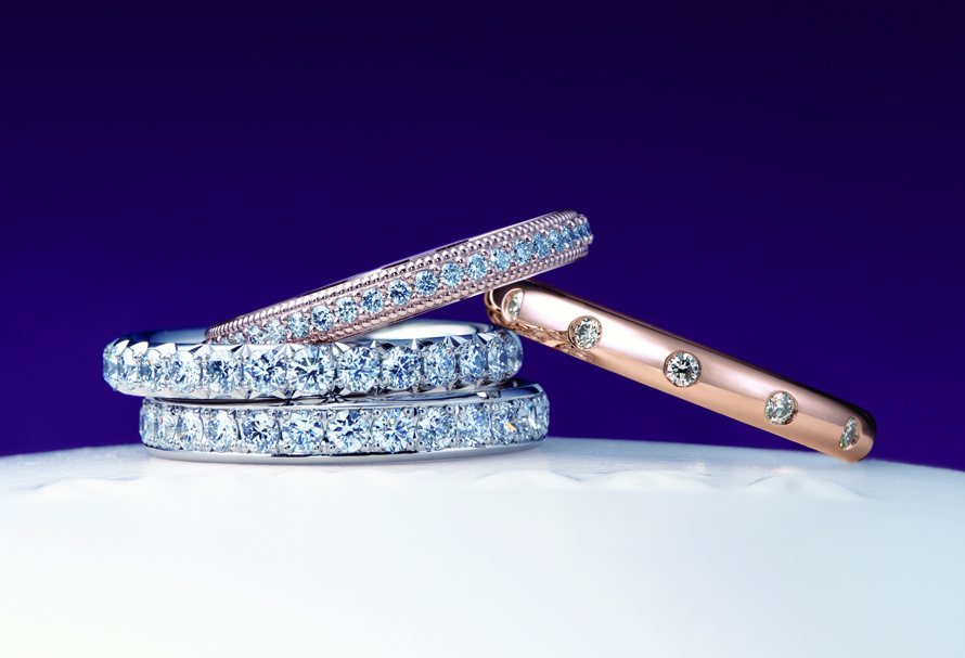 王道の1石タイプから、3石・5石・ハーフエタニティ・フルエタニティ選べる贅沢感。