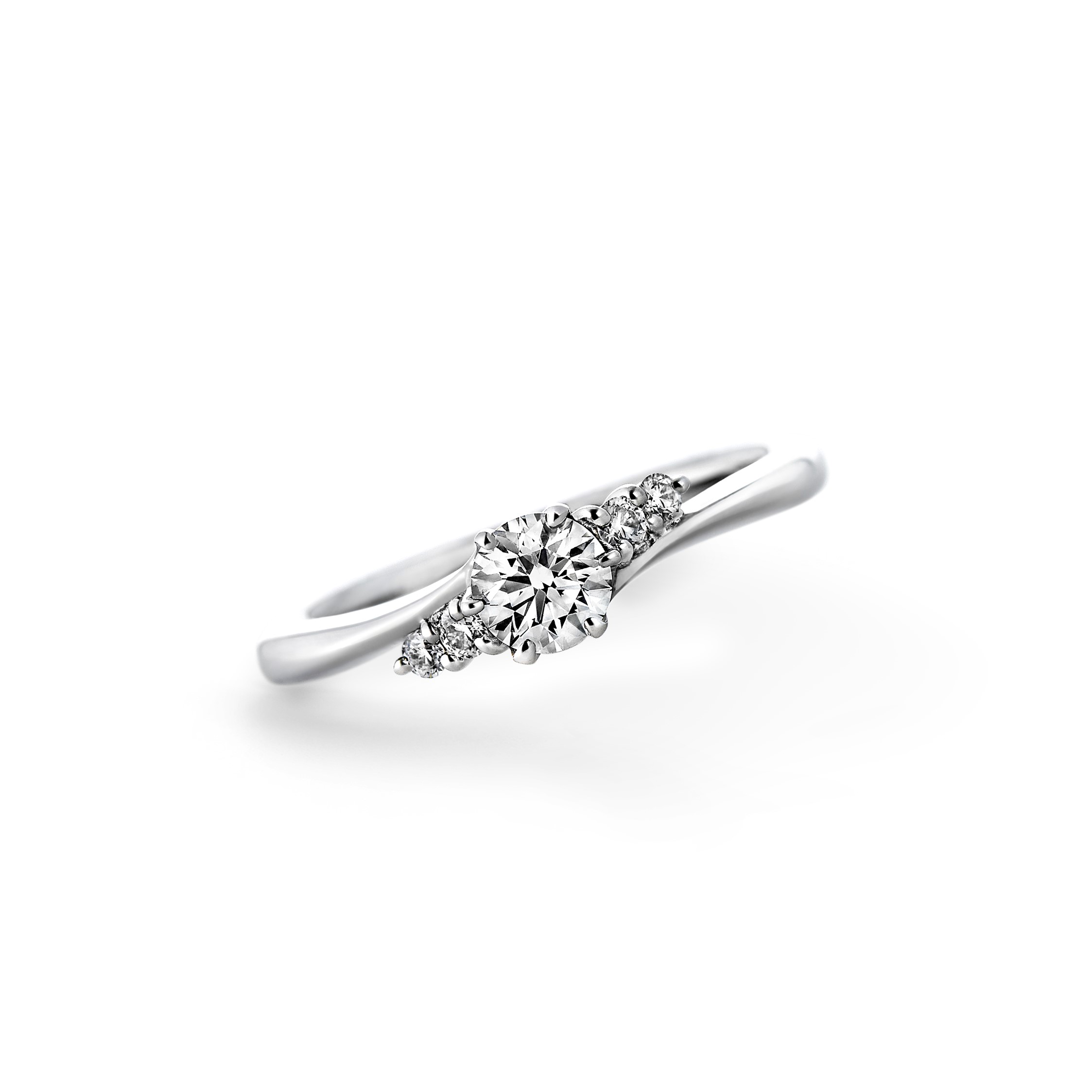 二人に降りそそぐやわらかな陽射しがせせらぎに輝く情景をイメージした婚約指輪。揺らめく水面に輝く光を、動きのあるダイヤモンドとラインで表現しています。