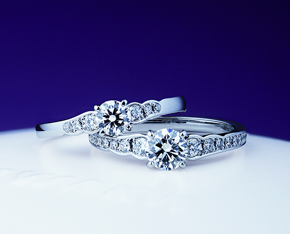 ダイヤモンドを包む丸みのある婚約指輪の形は可憐に咲くすずらんをイメージ。「幸福が訪れる」というすずらんの花言葉から、ふたりがいつも寄り添い幸せであるように願いを込めています。