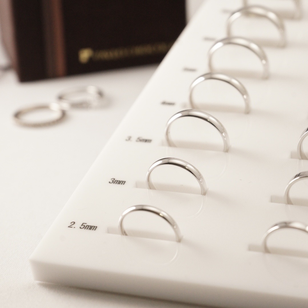自分の結婚指輪はもちろん、彼だったら○○mmくらいが似合いそうだな!とイメージしていただけたら、きっとスムーズに選べるはず。
