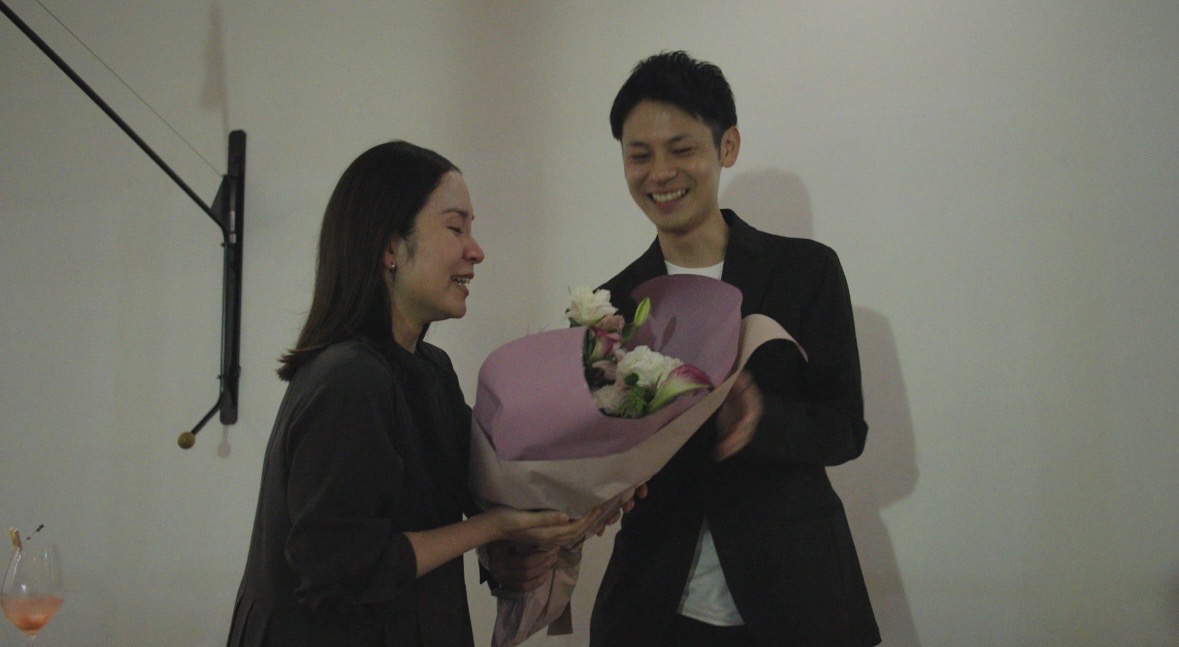 予想外のサプライズ、旦那様の想いが込められたメッセージに感動する奥様。つい笑ってしまう場面も。
