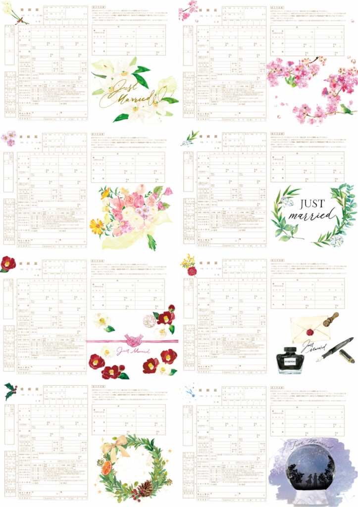 ご結婚されるお二人を祝福する気持ちを表現し、ご入籍されたときの思い出を彩る華やかなお花をテーマにした婚姻届が多くなっています。