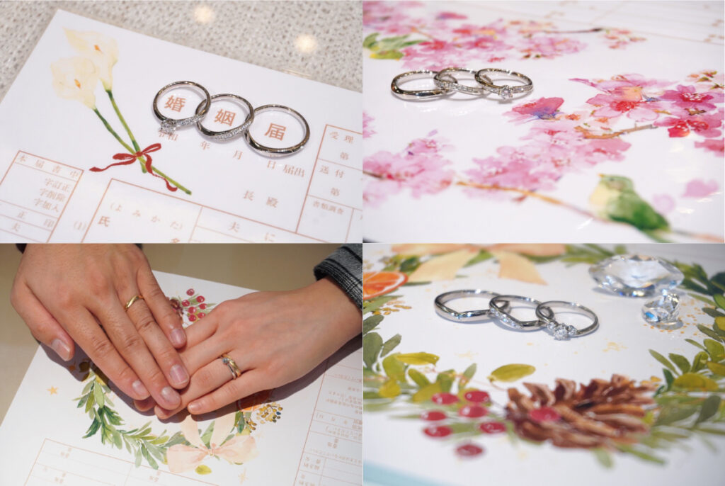 定番の「婚姻届」の文字を生かしたものから、指輪単体、お二人のお手元を写して……など幅広い撮影方法があります。可愛らしいイラストで、一生に一度の特別な写真がより一層華やかになります。
